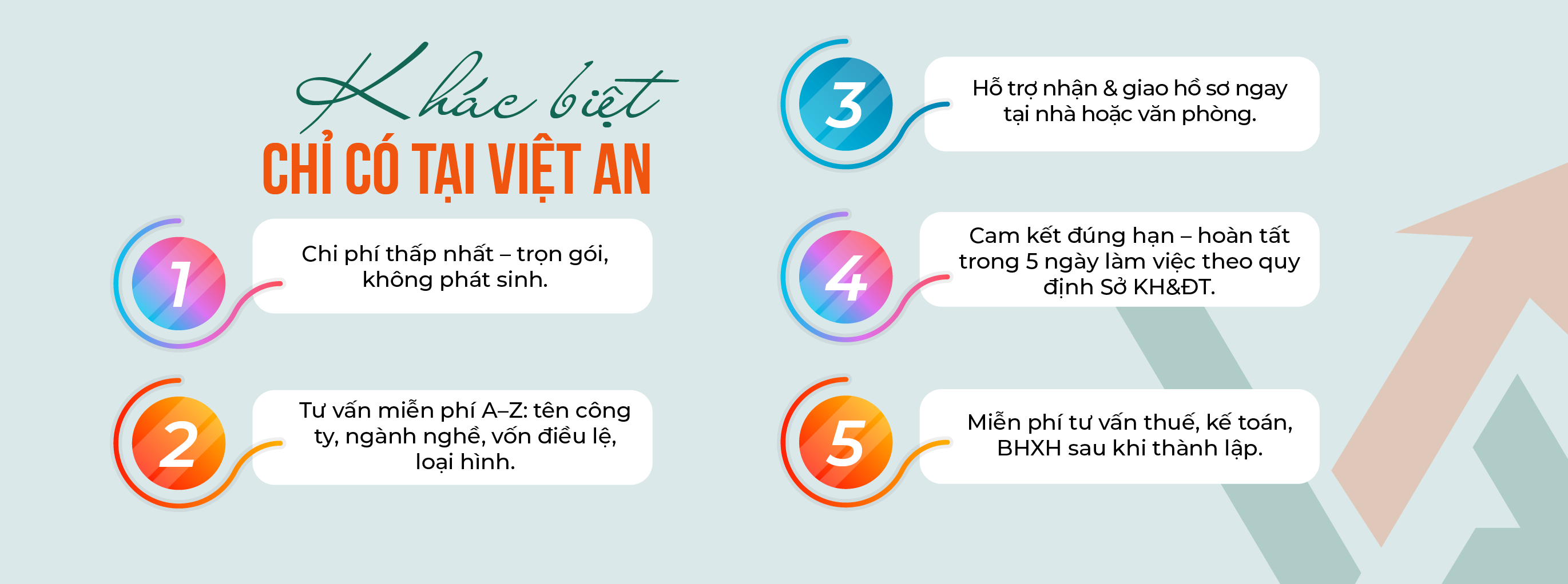 Chúng tôi hiểu rõ mỗi doanh nghiệp khi thành lập đều cần sự đơn giản, minh bạch và đồng hành tận tâm, vì vậy Việt An mang đến dịch vụ thành lập công ty trọn gói chỉ từ 250.000đ, giúp bạn yên tâm tập trung vào việc kinh doanh.